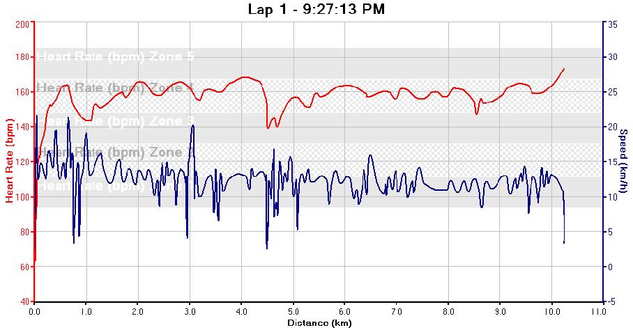 And now my heart rate vs distance. My speed is also shown. As is a bit evident, I finished with an uphill push.