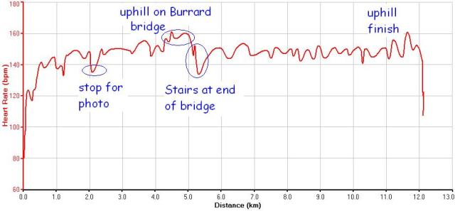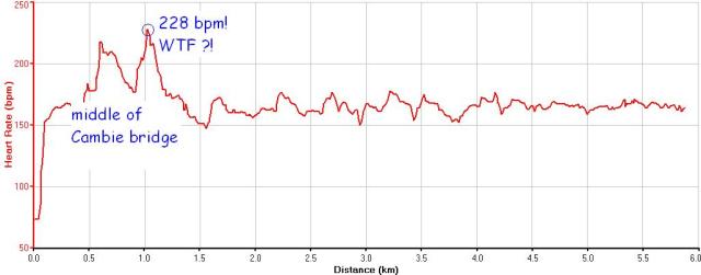 That enormous double spike in my heart rate is on the Cambie St bridge. The first one is definitely on an uphill but the second one (228 bpm!) is either right near the crest or is actually on the downhill. I am confused. I don’t recall any odd feelings. Maybe I got scared by something. That does happen sometimes.