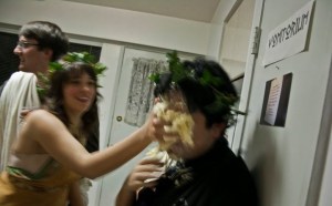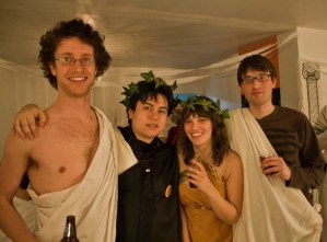 The evening had a toga theme complete with ivy crowns, palm fronds, grapes, and shots of some liquor concoction ostensibly having greek origins. Antics ensued.