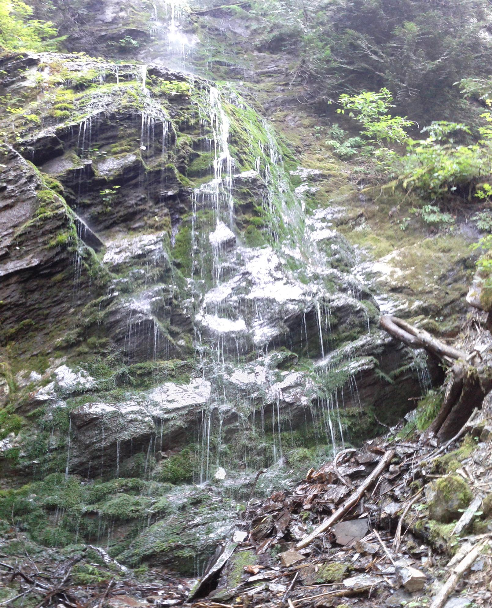 After reaching the shelf where I turned around last time, we began the journey North East along that narrow plateau. It was thick with devils club and occasional nettles – but far fewer nettles than we found in Stein or on my last visit here. I brought the machete once again and put it to immediate use. Hacking through devils club is much more difficult than other vegetation because its stems harden into a woody material as they age. I slashed at them and they slashed back. My right forearm got scraped up substantially. Wrapping several layers of cloth around my arm served as a somewhat effective armor. After a couple of hours foraging horizontally along what we presumed to be an old, overgrown logging road, our journey reached a rather abrupt end. We reached a substantial flow of water with slippery rocks and a large bushy cliff beyond. We turned around and came back down.
