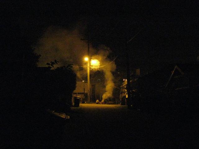 We found a great spot in the alley. After creating a bit of a stone circle, we poured in our chestnuts and then piled our combustibles on top. It took a bit of coaxing but we had a pretty good alley fire in short order. A few minutes later the Dunbar Patrol showed up with their Hi-Vis vests and flashlights.