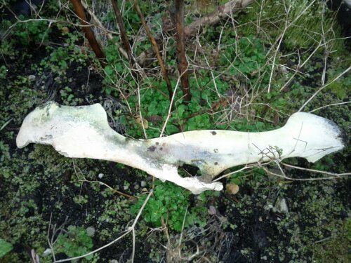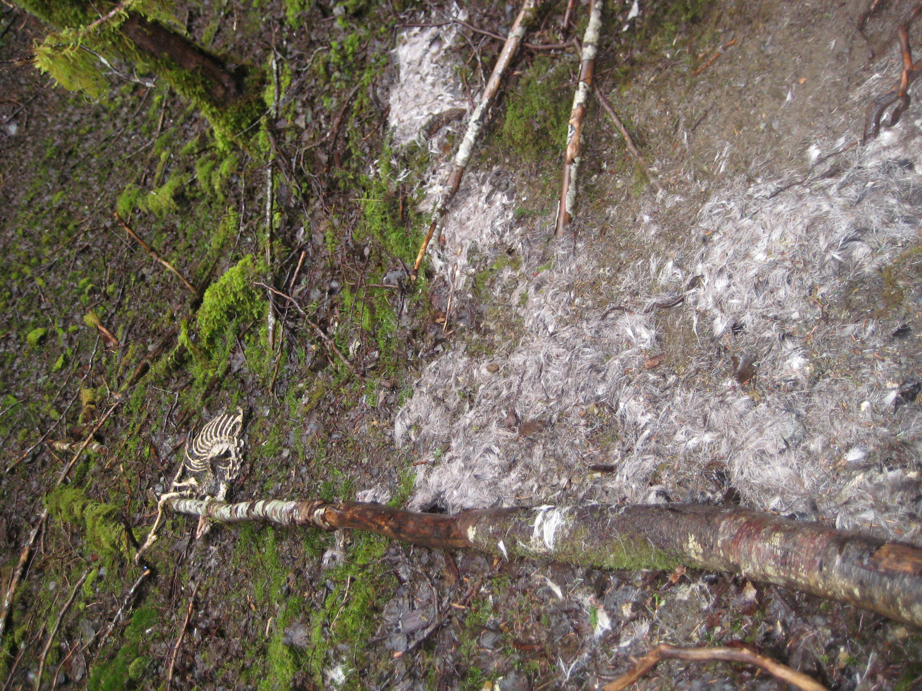 Tess climbed up the bank to investigate a pile of fur. Then she discovered she was nearly standing atop a skeleton. This one I am sure is Animalia Cordata.