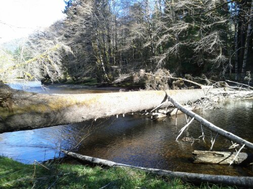 A rather substantial tree has recently fallen across the Yakoun, easily big enough to comfortably walk upon!