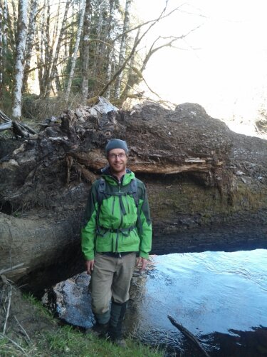 That original Queen Charlotte Main is no longer in much use and so now the tree is located down 4.5 km of under-maintained logging road. I wasn’t too concerned about the walk but was keen to find an alternative. A conversation with a fellow named Mike at the Ministry of Forests helped me pinpoint exactly where the tree was – on the south side of the river to the east of the old bridge site – but I was warned that fording the river was not likely to be possible. Mike spoke of an idea to fall a medium-large tree across the river near the old bridge site to make a foot crossing. Alas, this was still a dream so I was braced for a 9 km return trip on foot.