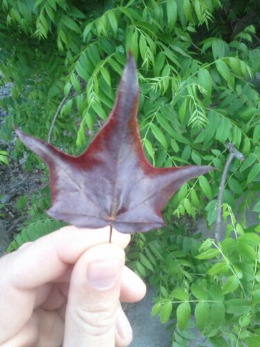 I think it is a Norway Maple (Acer platanoides). Both Doug and Joel correctly surmised it was a cultivar of Maple. It seems to be a cultivar that produces reddish-purple leaves rather than green ones. Most likely either “Crimson King” or “Schwedleri“.