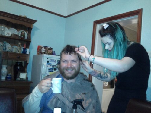 After a trip to the pub to appreciate the parts of town I missed when I lived here, we shuffled down the road a short distance to the home of Aunty Pauline. My cousin Sara is a hairdresser and had agreed to smarten us up a bit.