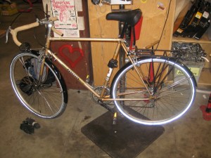 A few nights ago, after a libation or two, it was decided that the apocalypse bike needed a test ride. It was definitely not up to code. A cursory inspection revealed a badly rusted drive train, rear shifter housing that has been through a combine harvester, handle bars on upside down, front brake handle miss-configured and that is just the start. My cohort and I fixed the handle bars and brakes and rendered it capable of using three different gears. Then we went on a 2 am test ride. The bike was locked back in place by 9 am in slightly improved condition.